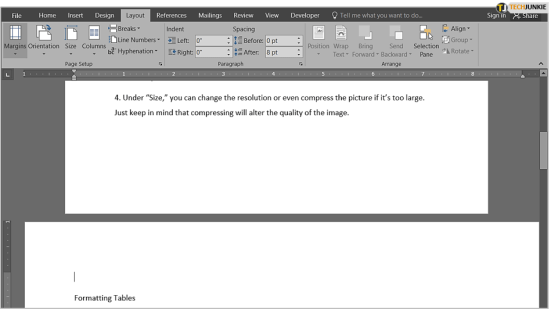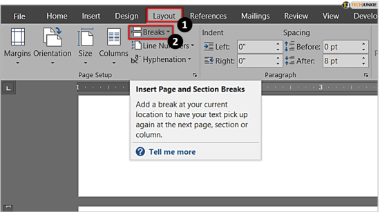 두 번째 페이지의 시작 부분을 클릭하여 시작합니다. 깜박이는 커서는 해당 페이지의 왼쪽 상단 모서리에 있어야 합니다(여백이 허용하는 한). 이제 화면 왼쪽 상단에 있는 리본 메뉴에서 " 레이아웃 " 탭을 클릭합니다. 그런 다음 " 나누기 " 아이콘을 클릭합니다. 두 페이지 사이에 약간의 공간이 있는 것처럼 보입니다.