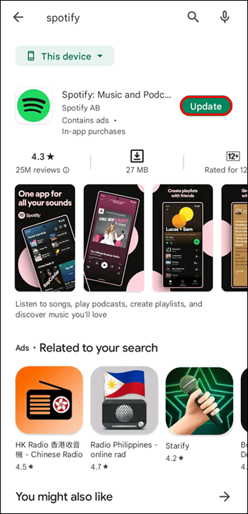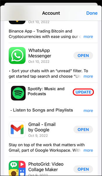 - Spotify 앱을 찾은 다음 '업데이트'를 탭합니다.