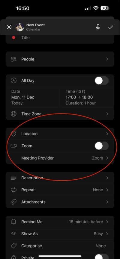 위에서 설명한 대로 Mac용 Outlook의 경우 Outlook 일정을 열고 새 이벤트를클릭하면 Zoom 추가 기능이 성공적으로 설치 및 활성화되었는지 확인할 수 있습니다. 이벤트 창에서줄임표(…)를클릭 하고 추가 기능 또는 통합 애플리케이션 섹션에서 '확대/축소'를 찾으세요.