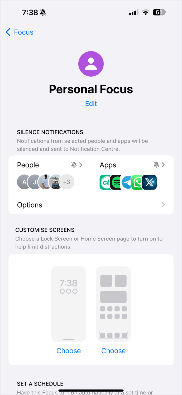iOS에는 사용할 수 있는 여러 Focus 프로필이 함께 제공됩니다. 선호도에 따라 사용자 정의를 만들 수도 있습니다. 다음은 개인 집중을 예로 들어 근무 시간 중에 예약하도록 하겠습니다.