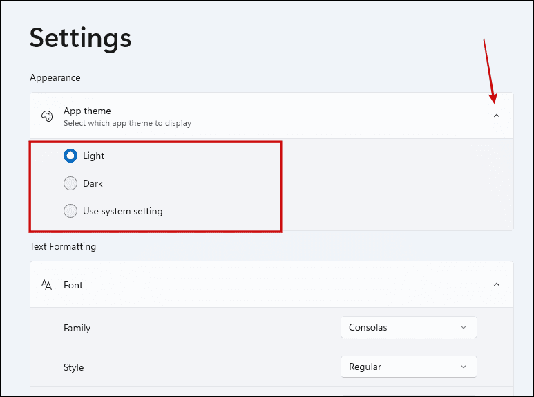 3단계: 앱 테마 옵션을 확장하여 밝게 , 어둡게 , 시스템 설정 사용을 선택 합니다 .