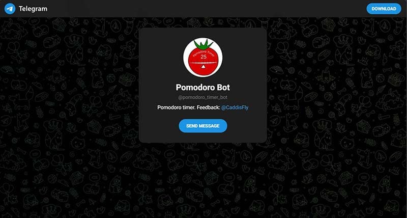 포모도로 시스템은 정기적인 휴식 시간을 예약하여 일을 처리하기 위한 잘 정립된 생산성 도구입니다. 이 봇은 포모도로 방식을 Telegram으로 가져와서 다른 곳에서 열어야 하는 번거로움을 덜어줍니다. 표준 25분 작업, 5분 휴식 루틴이 효과가 없다면 필요에 맞게 타이머를 조정하고 일정 기간 동안의 생산성 통계를 볼 수 있습니다.