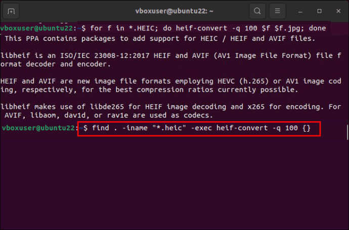 - *.HEIC에 "for f"를 입력하십시오. heif-convert -q 100 $f $f.jpg; done”을 사용하여 여러 HEIC 이미지를 한 번에 변환할 수 있습니다. -q 플래그는 변환에서 원하는 JPG 파일의 품질을 지정합니다. 1부터 100까지이며 최상의 화질을 위해 고급 피규어를 추천합니다.