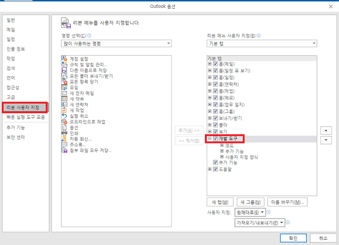 아웃룩 옵션 -> 리본 사용자 지정에서 개발도구를 체크하여 활성화 합니다.