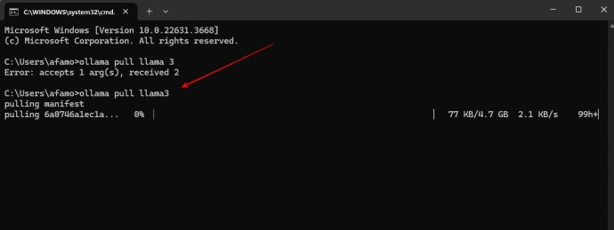 5단계: 아래 명령을 사용하여 첫 번째 AI 모델을 다운로드합니다. Ollama에서 모델을 실제 모델로 교체했는지 확인하세요 . Llama 3, Phi 3, Mistral, Gemma 등이 될 수 있습니다. 인내심을 가지세요. 시간이 좀 걸릴 수 있습니다.