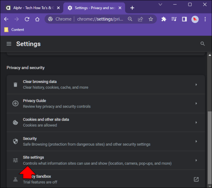 - "사이트 설정"을 선택한 다음 "권한"까지 아래로 스크롤합니다.