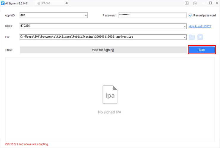 2-4) unc0ver 앱을 사이닝 하기 위해 Start 버튼을 눌러줍니다.