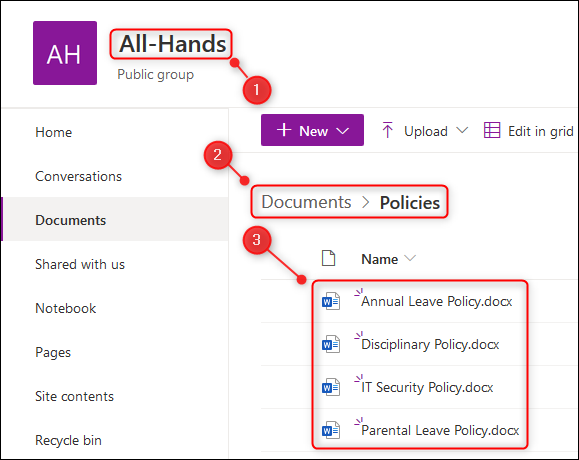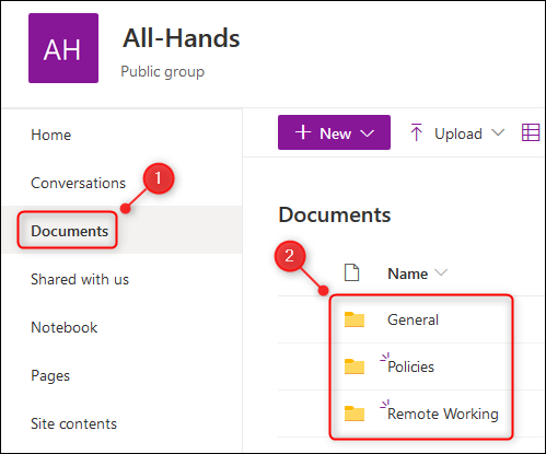왼쪽 메뉴에서 "문서"옵션을 클릭하면 해당 라이브러리의 모든 폴더가 표시됩니다. 팀의 각 채널에 대해 하나의 폴더가 있습니다.