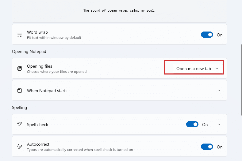 3단계: 메모장 열기 섹션에서 파일 열기 드롭다운에서 새 탭에서 열기 또는 새 창에서 열기를 선택합니다.
