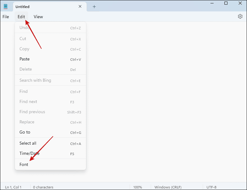 2단계: 편집 메뉴를 클릭 하고 글꼴을 선택합니다 .