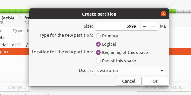 13. 다음으로, 스왑 파티션 / 영역 을 생성해야합니다 . 현재 여유 공간을 두 번 클릭하여 스왑 영역으로 사용할 새 파티션을 만듭니다. 그런 다음 스왑 파티션 크기를 입력하고 다음 스크린 샷과 같이 스왑 영역 을 설정 하십시오.