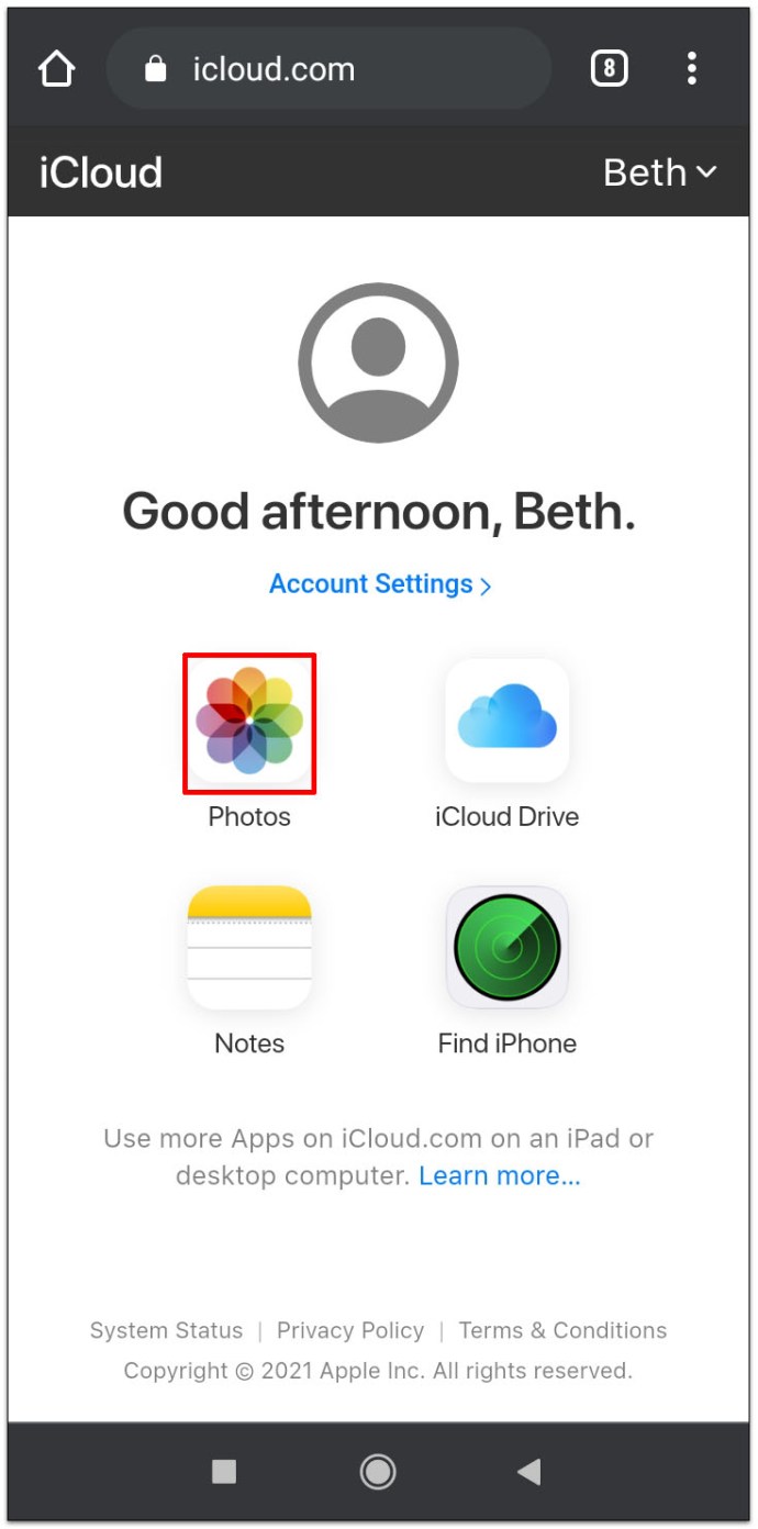 - 다음 화면에 iCloud 대시보드가 표시됩니다. 라이브러리를 보려면 '사진'을 탭하세요.