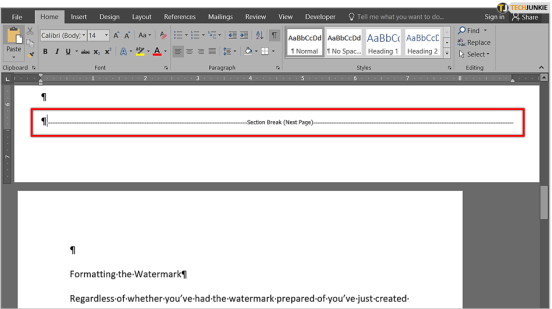 두 번째 페이지의 시작 부분을 클릭하여 시작합니다. 깜박이는 커서는 해당 페이지의 왼쪽 상단 모서리에 있어야 합니다(여백이 허용하는 한). 이제 화면 왼쪽 상단에 있는 리본 메뉴에서 " 레이아웃 " 탭을 클릭합니다. 그런 다음 " 나누기 " 아이콘을 클릭합니다. 두 페이지 사이에 약간의 공간이 있는 것처럼 보입니다.