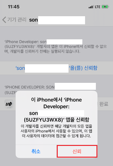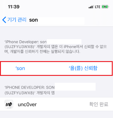 3-6) 신뢰 선택하게 되면 드디어 unc0ver 앱을 실행할 수 있습니다.