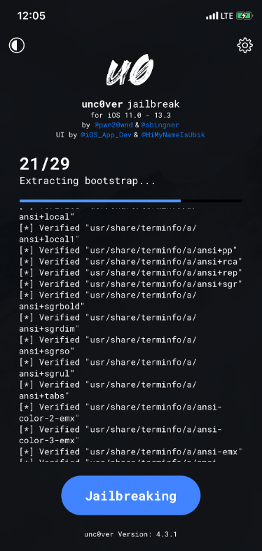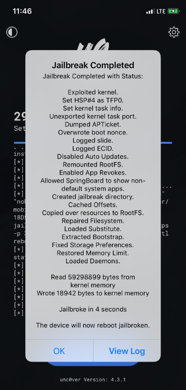 3-8) 탈옥이 진행되는 과정입니다. 진행하는 과정에서 재부팅을 하라는 메시지가 뜨거나 자동으로 재부팅이 되는 경우가 있는데 걱정하시지 마시고 다시 unc0ver 앱을 실행해서 Jailbreak를 누르면 탈옥 과정이 재진행 됩니다.