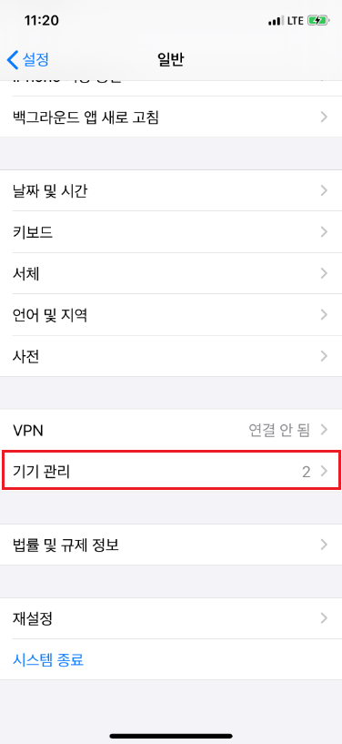 3-3) 일반 목록에서 쭉 내려오면 기기 관리 있습니다. 기기 관리 선택합니다.