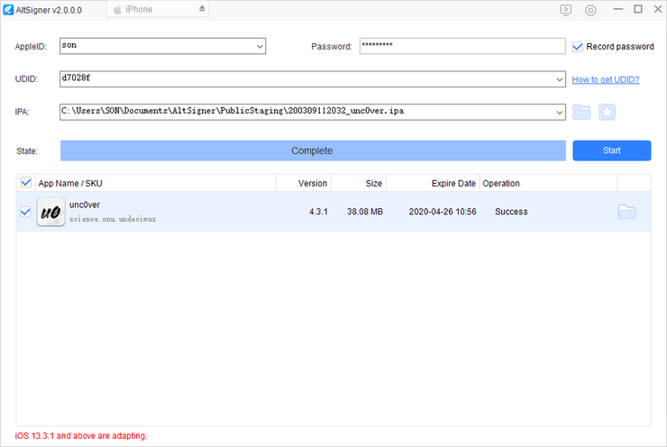2-4) unc0ver 앱을 사이닝 하기 위해 Start 버튼을 눌러줍니다.