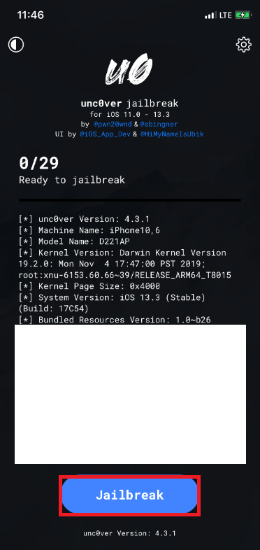 3-7) unc0ver 앱 실행하면 아래에 있는 Jailbreak 눌러서 탈옥을 진행합니다. Unsupported 나오시는 분은 unc0ver 앱이 지원하는 iOS 버전이 안맞아서 나오는거니 해당 iOS 버전을 확인하시길 바랍니다.