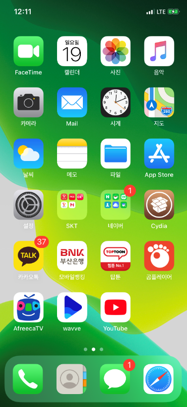 3-10) 짠!! 바탕화면에 Cydia 앱이 설치된 모습입니다. 축하드립니다. 여기까지 따라오느라 수고하셨습니다. 이제부터는 탈옥 라이프를 즐기시면 되겠습니다.