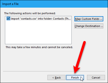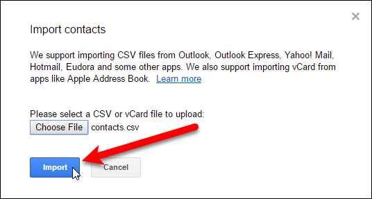연락처 가져 오기 대화 상자에서“가져 오기”버튼을 클릭하여 .csv 파일에서 연락처 가져 오기를 마칩니다.