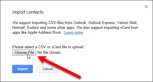 연락처 가져 오기 대화 상자에서 "파일 선택"단추를 클릭하십시오.