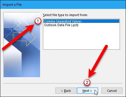 "쉼표로 구분 된 값"을 선택하고 "다음"버튼을 클릭하십시오.