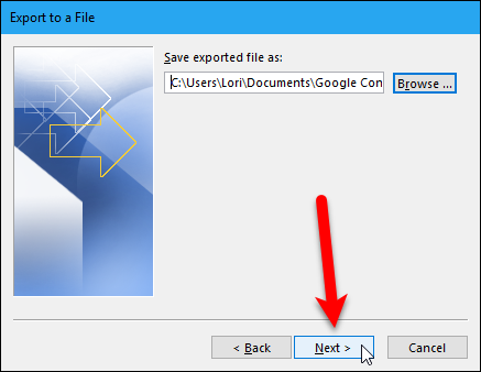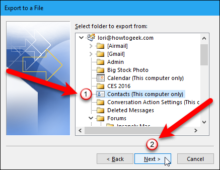 연락처가있는 이메일 계정 아래에서 내보낼 폴더 선택 상자에서 "주소록"을 선택하십시오. 그런 다음 "다음"버튼을 클릭하십시오.