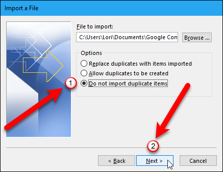 옵션에서 복제본을 가져올 지 여부를 결정하십시오. "중복 항목을 가져 오지 마십시오"를 선택하여 나중에 시간을 절약 할 수 있습니다. "다음"버튼을 클릭하십시오.