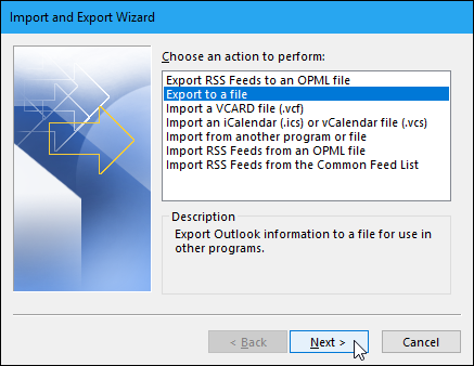 가져 오기 및 내보내기 마법사 대화 상자가 표시됩니다. 수행 할 작업 선택에서 "파일로 내보내기"를 선택한 다음 "다음"버튼을 클릭하십시오.