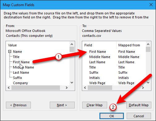 파일로 내보내기 대화 상자의 마지막 화면에 발생하는 상황 ( "폴더에서 '주소록 내보내기 : 연락처")이 표시되고 Outlook에서 만든 사용자 정의 필드를 매핑 할 수있는 기회가 제공됩니다.
