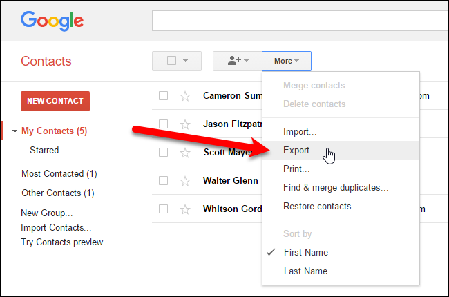 이전 버전의 Google 주소록으로 돌아 오면 페이지 상단의 '추가'를 클릭하고 드롭 다운에서 '내보내기'를 선택하십시오.
