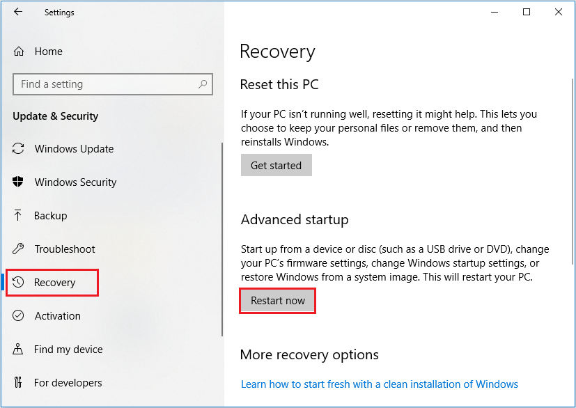 2 단계.이 인터페이스에서 복구를 선택 합니다. 상기 고급 시작 섹션, 지금 다시 시작을 클릭합니다 . 그런 다음 시스템이 다시 시작됩니다.
